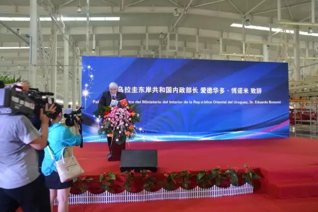 7月13日上午,河北跃迪新能源科技集团有限公司向乌拉圭东岸共和国捐赠车辆仪式在跃迪集团总装车间顺利举行。出席本次捐赠仪式的领导和嘉宾有:乌拉圭内政部长爱德华多·博诺米、乌拉圭国家警察局局长马里奥·莱蒙·雷耶拉·潘撒多、内政部信息顾问费德里科·达尼尔·拉卡·卡尔西亚、秘书处主任恰雷斯·丹尼尔·卡雷拉·雷奥、乌拉圭驻华使馆代办劳拉·希尔瓦、乌拉圭驻华使馆国防武官米盖尔·托雷斯、乌拉圭驻华使馆中秘王蕊;河北省工信厅副厅长王学军,河北省商务厅副厅长董志方,河北省贸促会副会长张健生,石家庄市政府副市长蒋文红,石家庄市政府副秘书长杨文斌,石家庄市外办主任栾建英,石家庄市工信局、市发改委、市城管委、市工商业联合会等领导,中共元氏县委、县人民政府领导,河北省电动汽车产业协会成员,北大光华管理学院校友,河北跃迪集团董事长吕洪涛、跃迪集团副总裁兼集团汽车研究院院长刘明海等集团领导以及各界行业媒体朋友。
