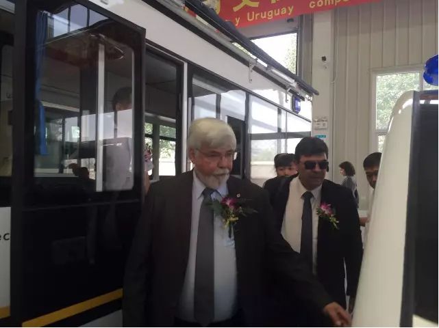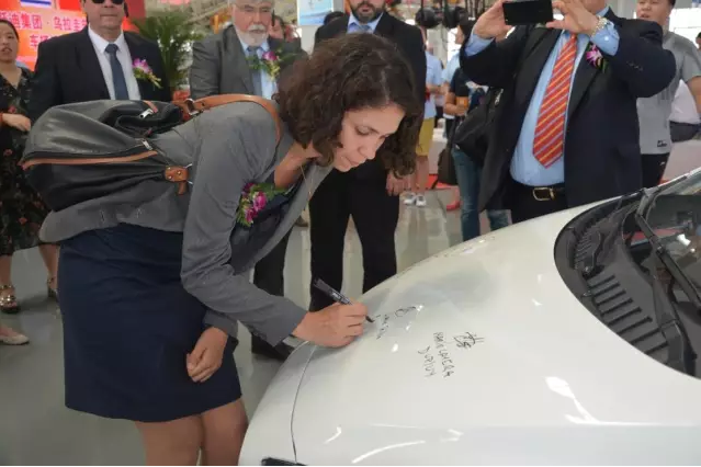 乌拉圭内政部长爱德华多·博诺米一行在跃迪YD360车身上签名留念