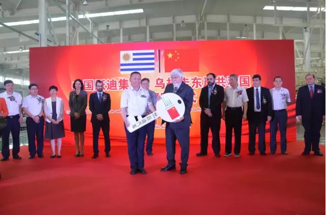 跃迪集团董事长吕洪涛亲手将车钥匙交付给乌拉圭内政部长爱德华多·博诺米