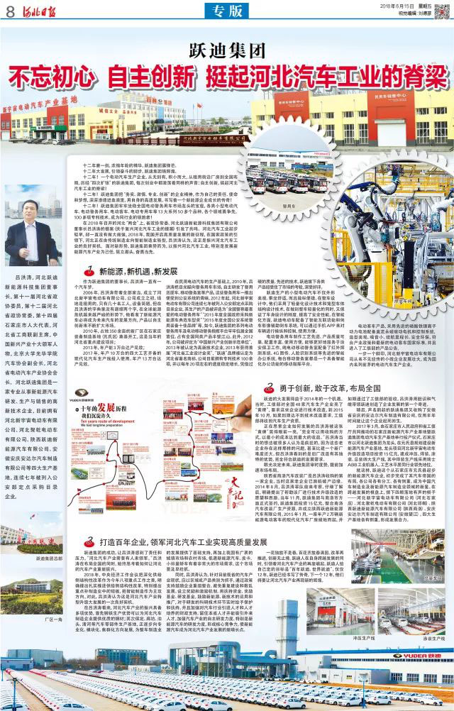 6月15日,《河北日报》第八版发表专版文章,以《跃迪集团 不忘初心 自主创新 挺起河北汽车工业的脊梁》为题,全面报道了河北跃迪集团新能源科技集团有限公司在自主创新、高质量发展中取得的成功经验。