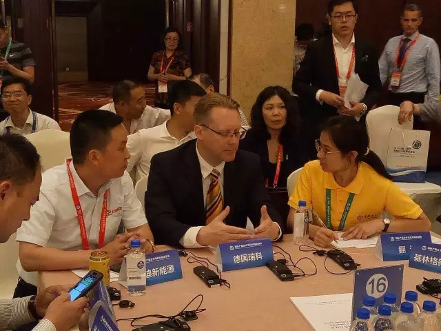 洽谈会上跃迪集团销售公司总经理龙其华与德国瑞科总经理魏家驹等中外企业代表就新能源领域展开合作洽谈,跃迪新能源汽车、跃迪新能源客车、跃迪新能源警务用车、跃迪新能源专用车四网合一的独特优势成果赢得了中外企业代表赞誉。