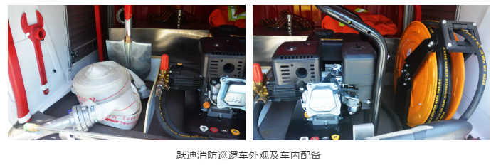跃迪消防巡逻车小巧灵便、输出功率大、加速性能好,能在第一时间抵达火灾险情现场。车上配备有消防斧、消防锨、消防扳手等破拆工具,灭火器、加压泵、消防水枪、水带、防毒面具、消防服等灭火救援装备,集消防、宣传、巡逻、排查功能于一体,既可用于突发情况的应急灭火,也可应用于日常消防巡逻任务,被广泛应用于社区、商场、校园、景区等场所的消防巡逻、火情预报、初级火情处理工作。