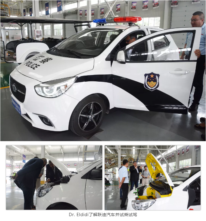 在跃迪集团年产能13万辆新能源汽车的冲压、焊装、涂装、总装四大工艺车间,Dr. Eldidi一行深入了解了跃迪系列车型的生产流程、技术优势、车辆配置等情况,并试乘试驾跃迪新能源汽车,亲身感受了跃迪汽车安全、方便、舒适的优越性能。