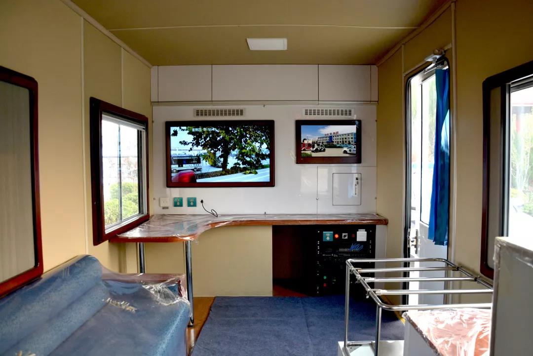 (3)功能区分更明确,跃迪牵引式移动警务室对警务室整体尺寸进行了调整,使得室内空间更加舒适,并且有效的布局办公区域、对智能监控台、休息区、卫生间也进行了合理的空间搭配,进一步体现了警务室的威严、规范及标准化人性化设计理念。