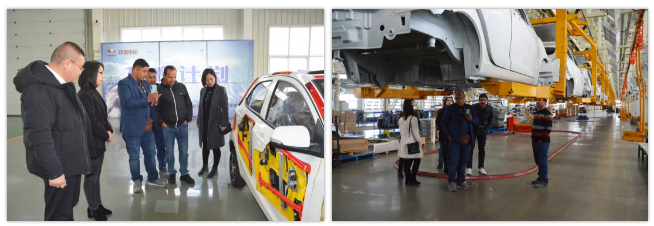 考察团一行在跃迪集团乘用车销售公司总经理吴耀明的陪同下,先后参观了跃迪集团四大工艺车间、车辆展示区。参观过程中,集团乘用车销售公司总经理吴耀明向考察团一行详细介绍了集团四大基地产业布局、产品研发成果、技术创新成果及未来发展规划等情况。