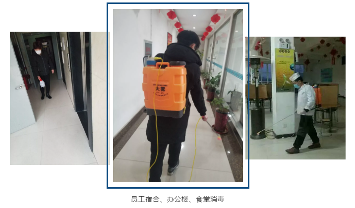 办公楼、车间、餐厅、员工宿舍、厂区道路等工作区域指派专人每天喷洒至少两遍消毒药水,明确责任,建立消毒登记表,疫情防控小组每天检查,确保消毒工作的全面落实。