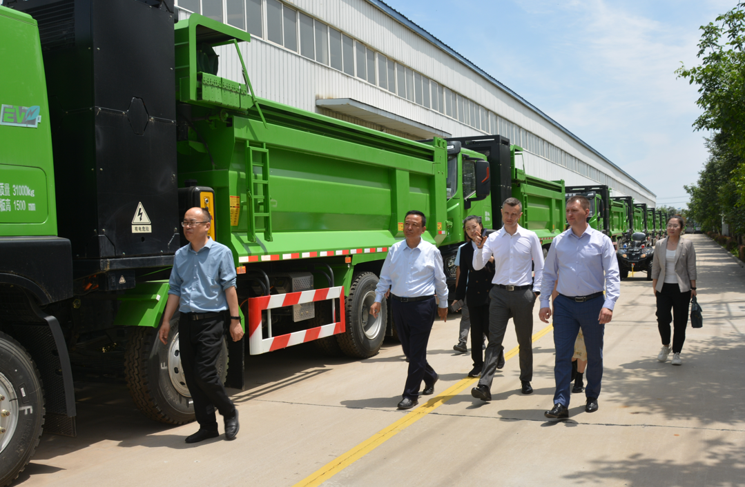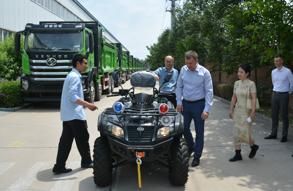 跃迪集团董事长吕洪涛还向亚历山大·叶菲莫夫一行介绍了河北跃迪集团生产的新能源环卫车型、新能源重卡系列、全地形车辆等车型。