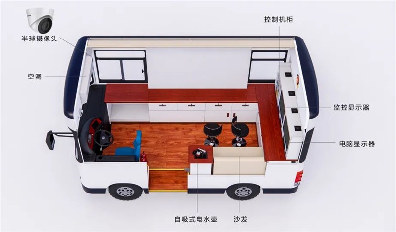 跃迪拖挂警务室内配备简易生活设备,可满足驻车车内多人同时办公、咨询、现场作业,具有现场办公指挥、恶劣环境执勤等功能。