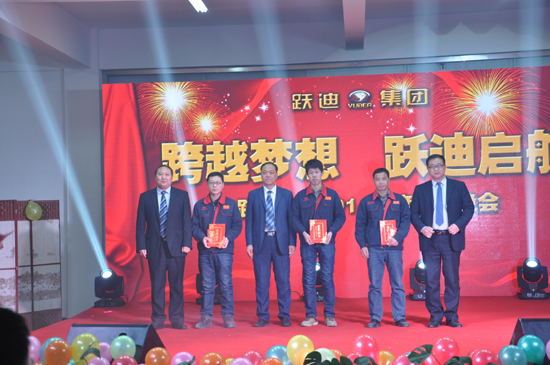 随后,伴随着采购部李建辉欢畅、吉祥的《欢聚一堂》歌曲,跃迪集团2014年度工作表彰、颁奖环节正式开始。会上,对来自跃迪集团下属河北新宇宙电动车有限公司、河北聚乾电动车有限公司、陕西跃迪新能源科技有限公司的16名优秀员工、3名优秀标兵(质量标兵、技术标兵、售后标兵),2名优秀中层管理人员、2名优秀销售经理,1个优秀团队进行了依次颁奖。期间,还穿插着跃迪人带来的精彩歌曲、舞蹈。