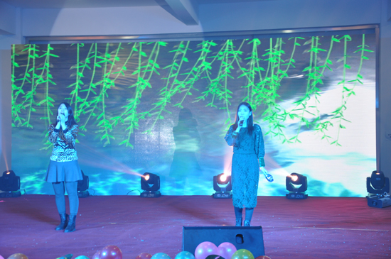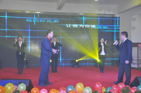 晚宴期间,节目表演与游戏互动环节让现场异常热闹。多才多艺的跃迪人,纷纷登台亮相,一展风采。外联部、采购部、人资部带来的舞蹈《电话情缘》、《小苹果》舞姿优美,整齐划一;生产系统和行政系统组合演唱歌曲+手语舞《我的好兄弟》激情励志,引起现场共鸣,感动了在场所有的跃迪人;生产系统的独唱《趁早》、《王妃》等情深意切,诙谐幽默的《搞笑版新闻联播》别有创意,频频得到大家的掌声;采购部的歌曲《梦里水乡》旋律优美......现场气氛活跃、高涨,后,董事长吕洪涛及在座的高管领导也陆续登台献唱。