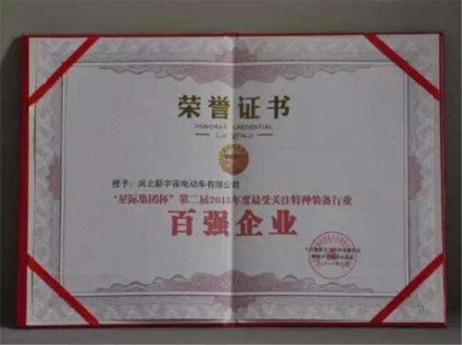 跃迪集团旗下河北新宇宙电动车有限公司荣获星际集团杯第二届2015年度特种装备行业百强企业