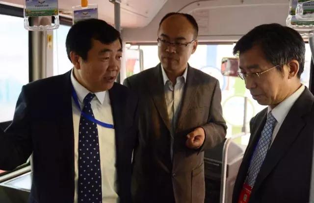 河北省人民政府办公厅副巡视员郝杰成(右一)、河北省商务厅投促局局长安静(左一)在跃迪集团销售公司警用车销售分公司总经理崔清学陪同下登上跃迪新能源客车进行体验