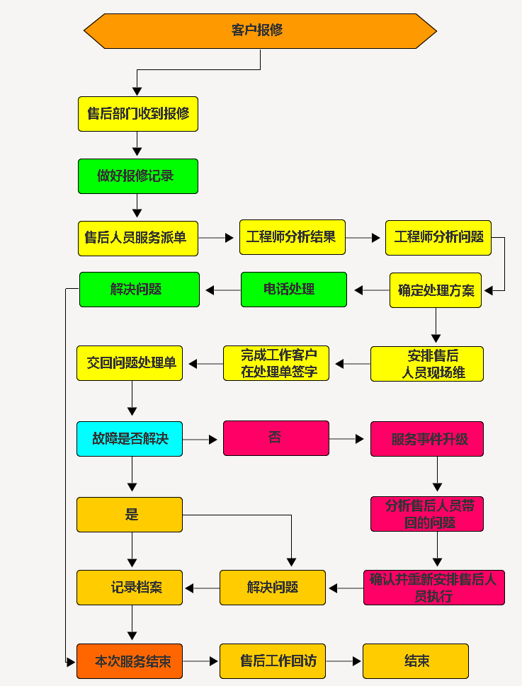 客户报修→售后部门收到报障→售后部门编制服务派单→安排工程师分析问题→工程师分析结果适合哪一类处理方案→安排售后人员实施方案并执行→客户在服务单上签字→交回服务单→是否解决问题→是或否→是→在产品售后管理系统进行填单解决方案。→如果是“否”→服务事件升级→分析售后人员带回的问题确认故障→重新安排售后人员上门服务→解决问题。