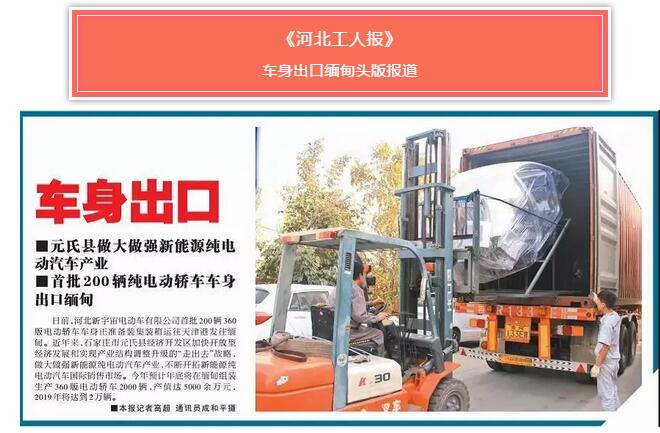 2018年10月,河北新宇宙纯电动轿车车身批量出口缅甸受到《河北工人报》头版报道。