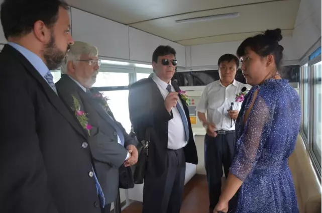 乌拉圭内政部长在跃迪集团董事长吕洪涛、跃迪副总裁刘明海的陪同下观摩了捐赠车辆并登上跃迪移动警务室近距离体验