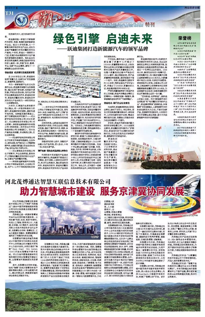 5月18日,《河北经济日报》“2018中国·廊坊国际经济贸易洽谈会”特刊中刊发题为《绿色引擎 启迪未来——跃迪集团打造新能源汽车的领军品牌》文章,详细阐述跃迪集团在市场布局、产品研发等方面的优势,赞扬集团在践行社会责任、推进新能源汽车发展方面做出的突出贡献。