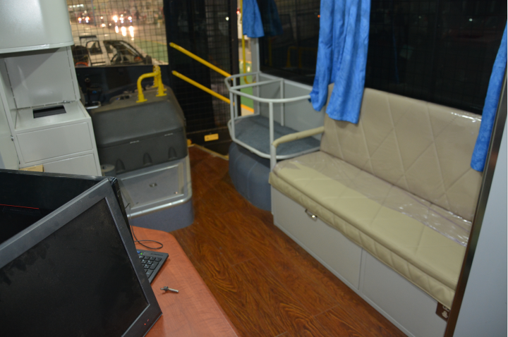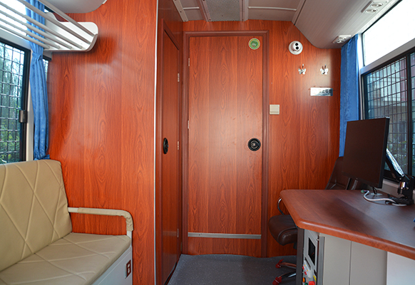8米跃迪移动警务室(汽油)根据公安系统特点和移动办公的需求,开发设计的能乘坐一定工作人员的新型警务用车。配备警示宣传系统、警务办公系统、警务通信系统、监控系统、图传系统、供电系统、照明系统及简易生活设备,具有现场办公指挥、应急通信、图像4G传输、现场照明、强声广播、恶劣环境执勤等功能,能满足移动办公、警务前移、检查、卡口、维护治安等需要。