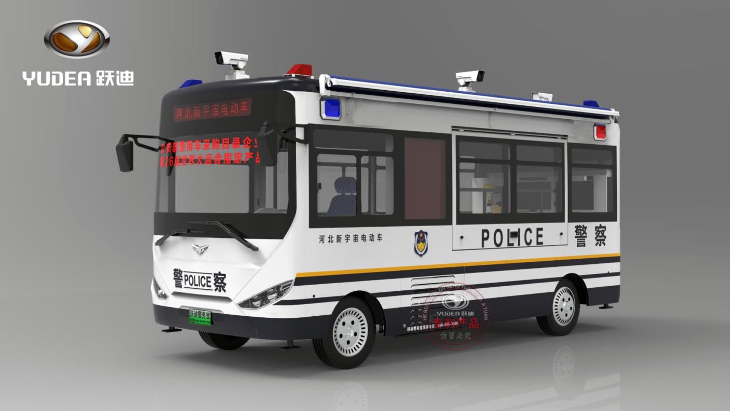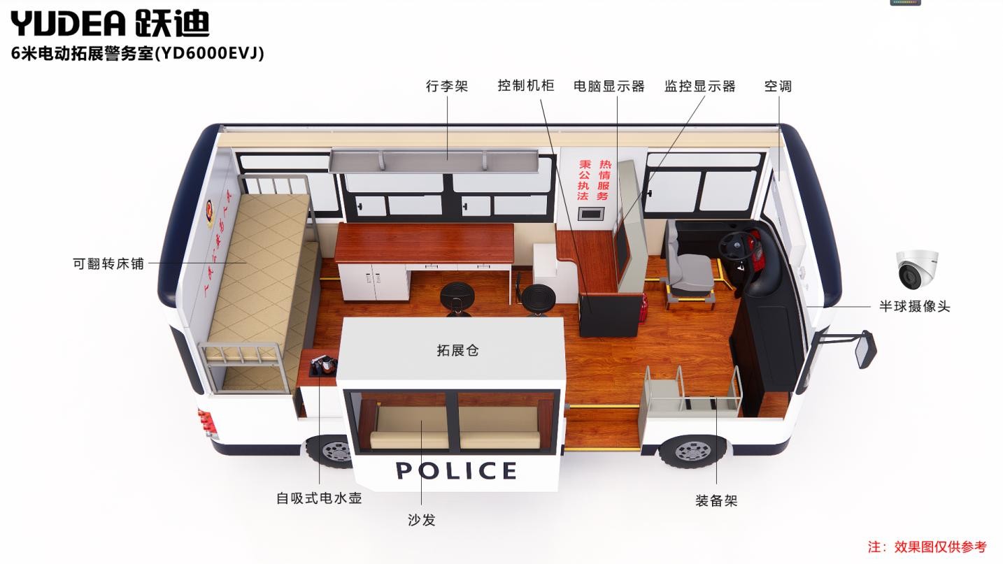 跃迪6米拓展移动警务室(电动)根据公安系统特点和移动办公的需求,开发设计的能乘坐一定工作人员的新型警务用车。配备警示宣传系统、警务办公系统、警务通信系统、监控系统、图传系统、供电系统、照明系统及简易生活设备,具有现场办公指挥、应急通信、图像4G传输、现场照明、强声广播、恶劣环境执勤等功能,能满足移动办公、警务前移、检查、卡口、维护治安等需要。