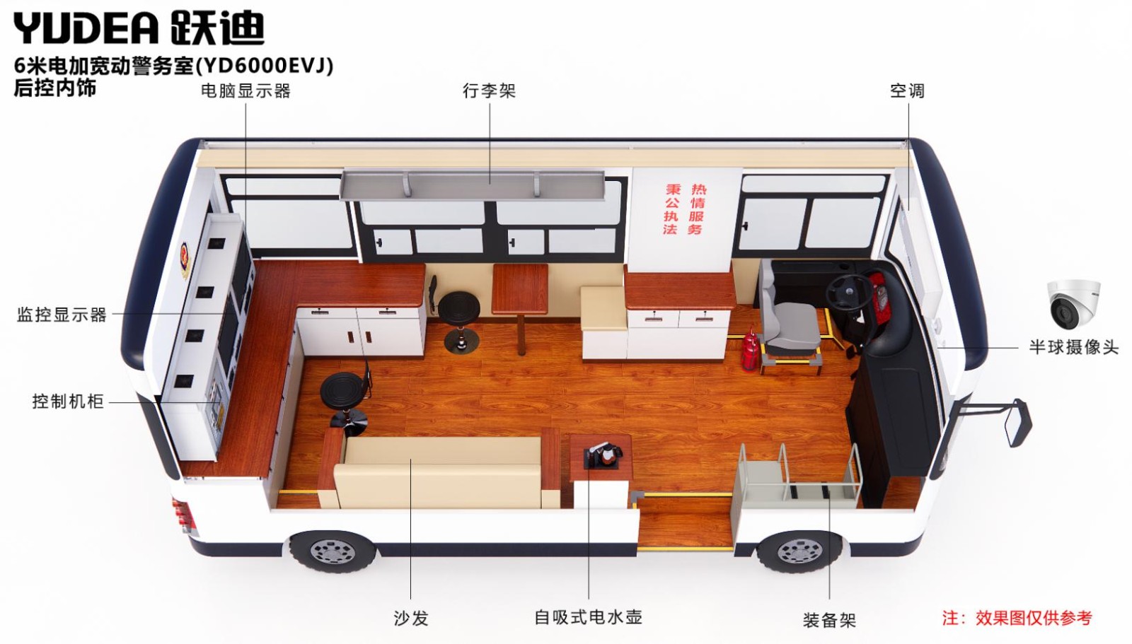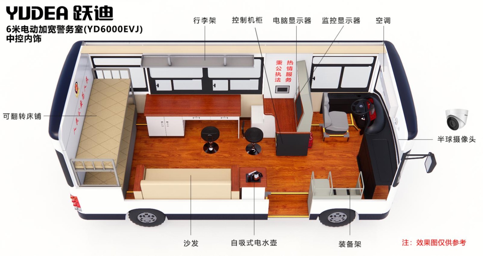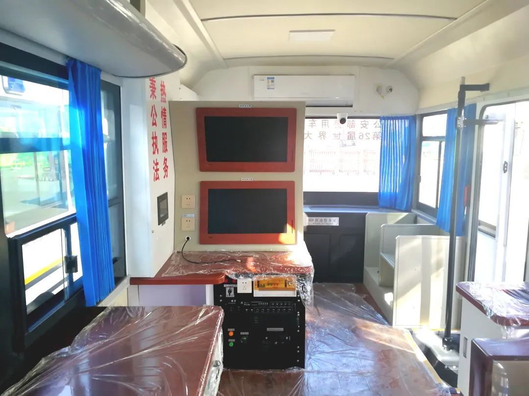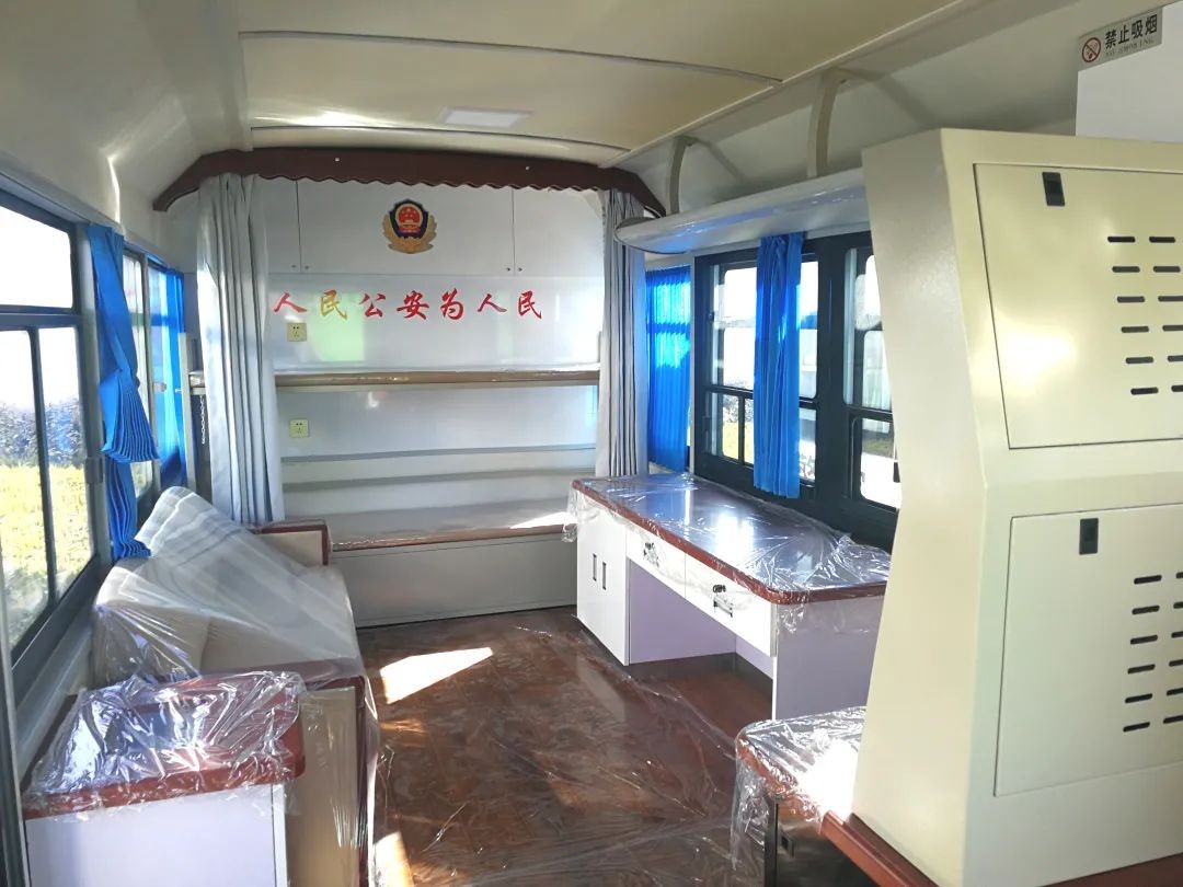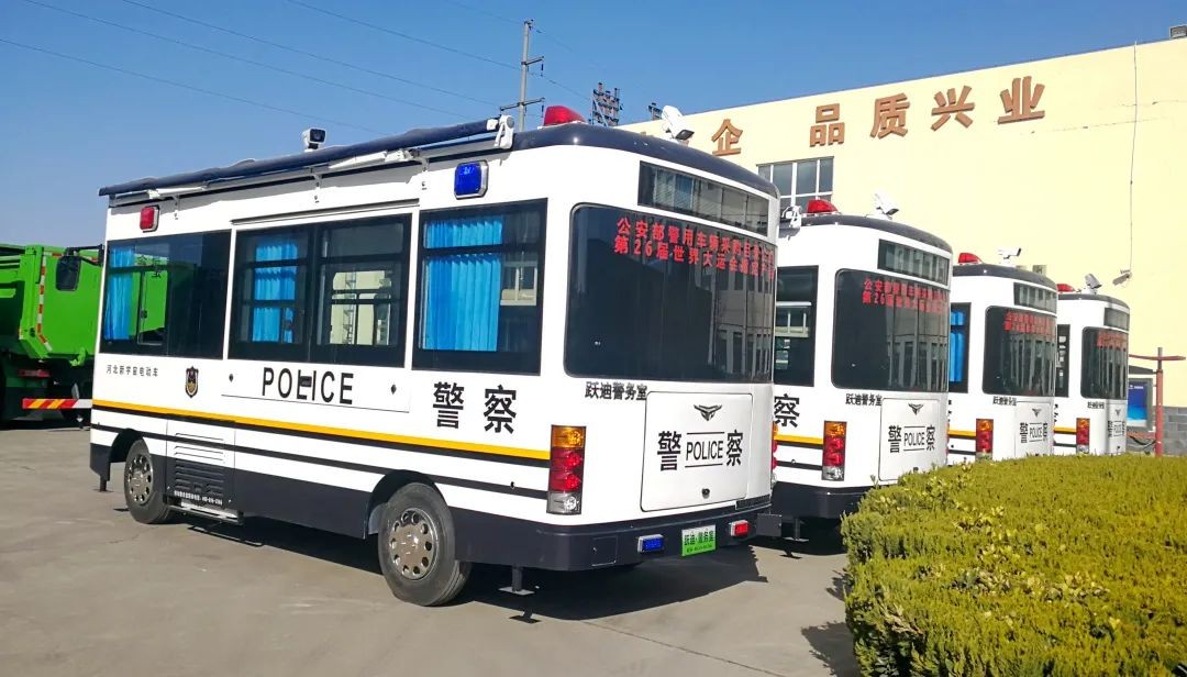 6米跃迪加宽移动警务室(电动)根据公安系统特点和移动办公的需求,开发设计的能乘坐一定工作人员的新型警务用车。配备警示宣传系统、警务办公系统、警务通信系统、监控系统、图传系统、供电系统、照明系统及简易生活设备,具有现场办公指挥、应急通信、图像4G传输、现场照明、强声广播、恶劣环境执勤等功能,能满足移动办公、警务前移、检查、卡口、维护治安等需要。