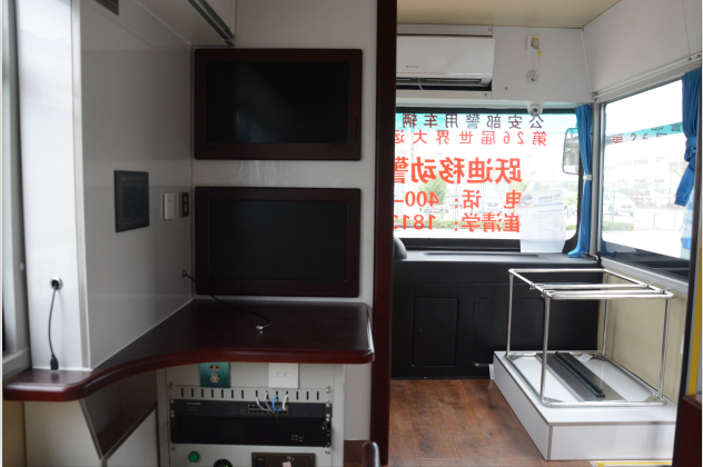 6米跃迪城管移动拓展执勤室(电动)配备警示宣传系统、警务办公系统、警务通信系统、监控系统、图传系统、供电系统、照明系统及简易生活设备,具有现场办公指挥、应急通信、图像4G传输、现场照明、强声广播、恶劣环境执勤等功能,能满足移动办公、警务前移、检查、卡口、维护治安等需要。