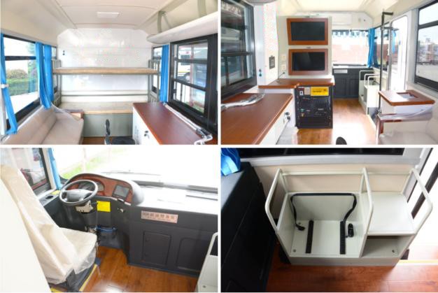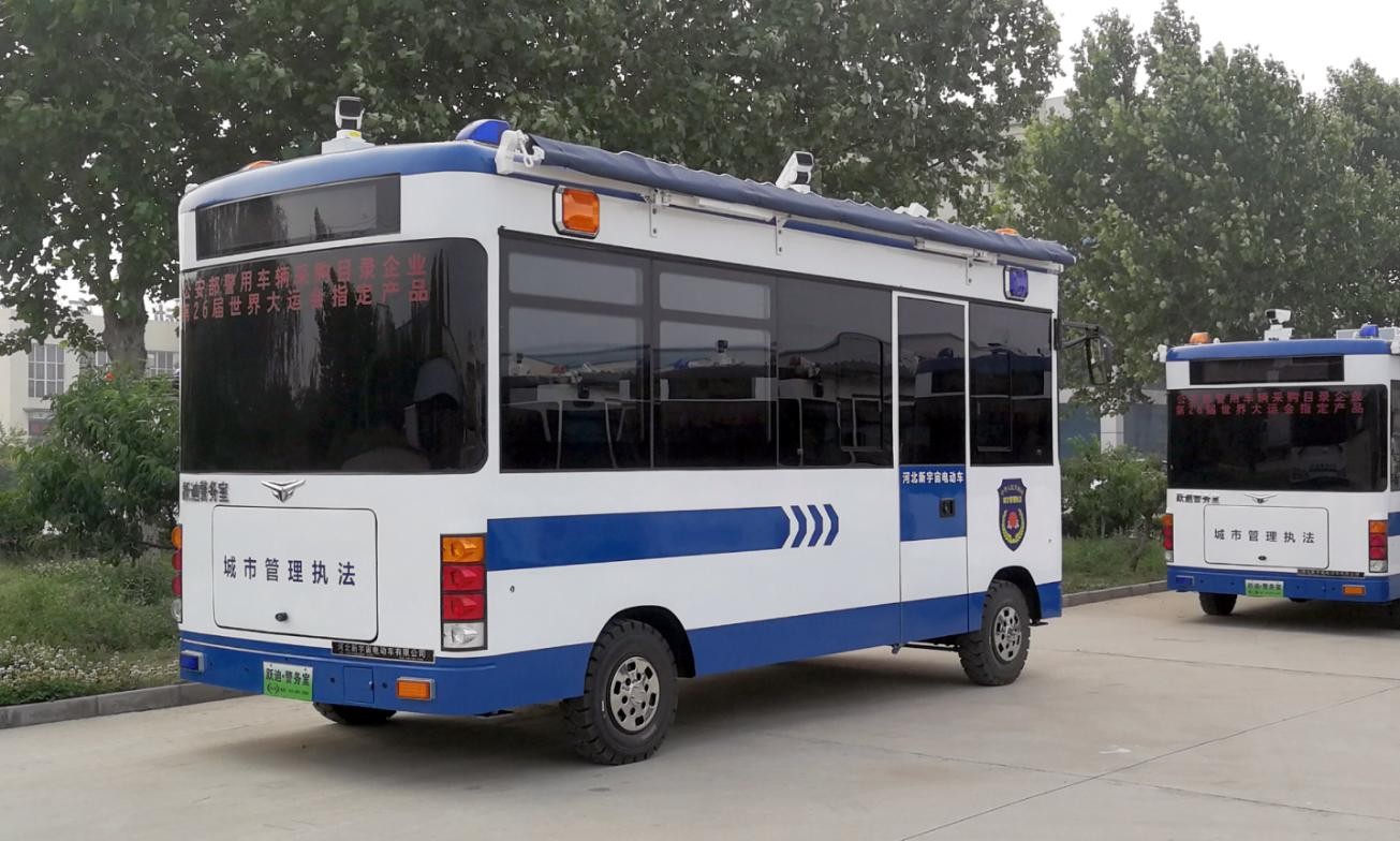 5.6米跃迪移动城管执法车(电动)配备警示宣传系统、警务办公系统、警务通信系统、监控系统、图传系统、供电系统、照明系统及简易生活设备,具有现场办公指挥、应急通信、图像4G传输、现场照明、强声广播、恶劣环境执勤等功能,能满足移动办公、警务前移、检查、卡口、维护治安等需要。